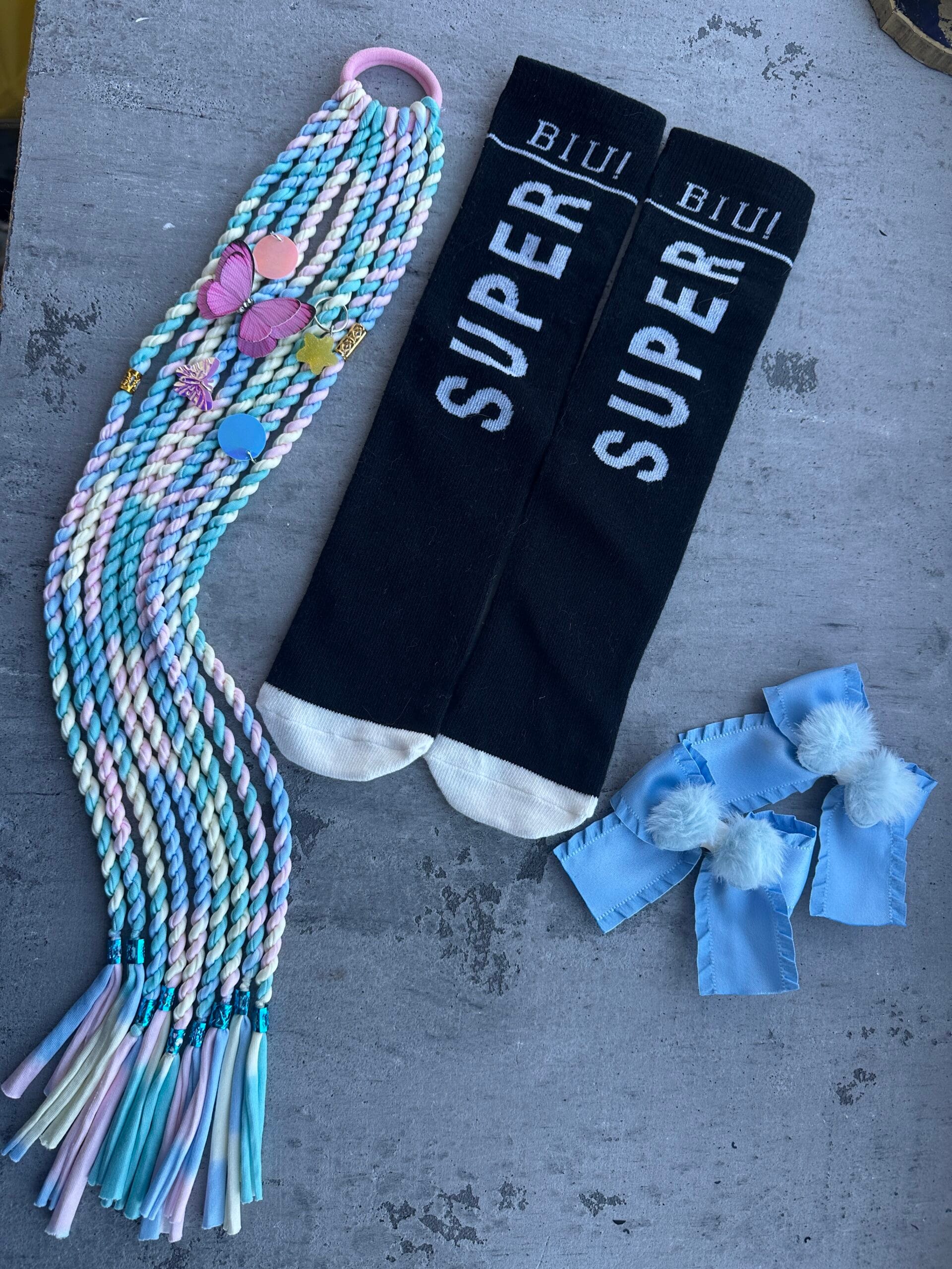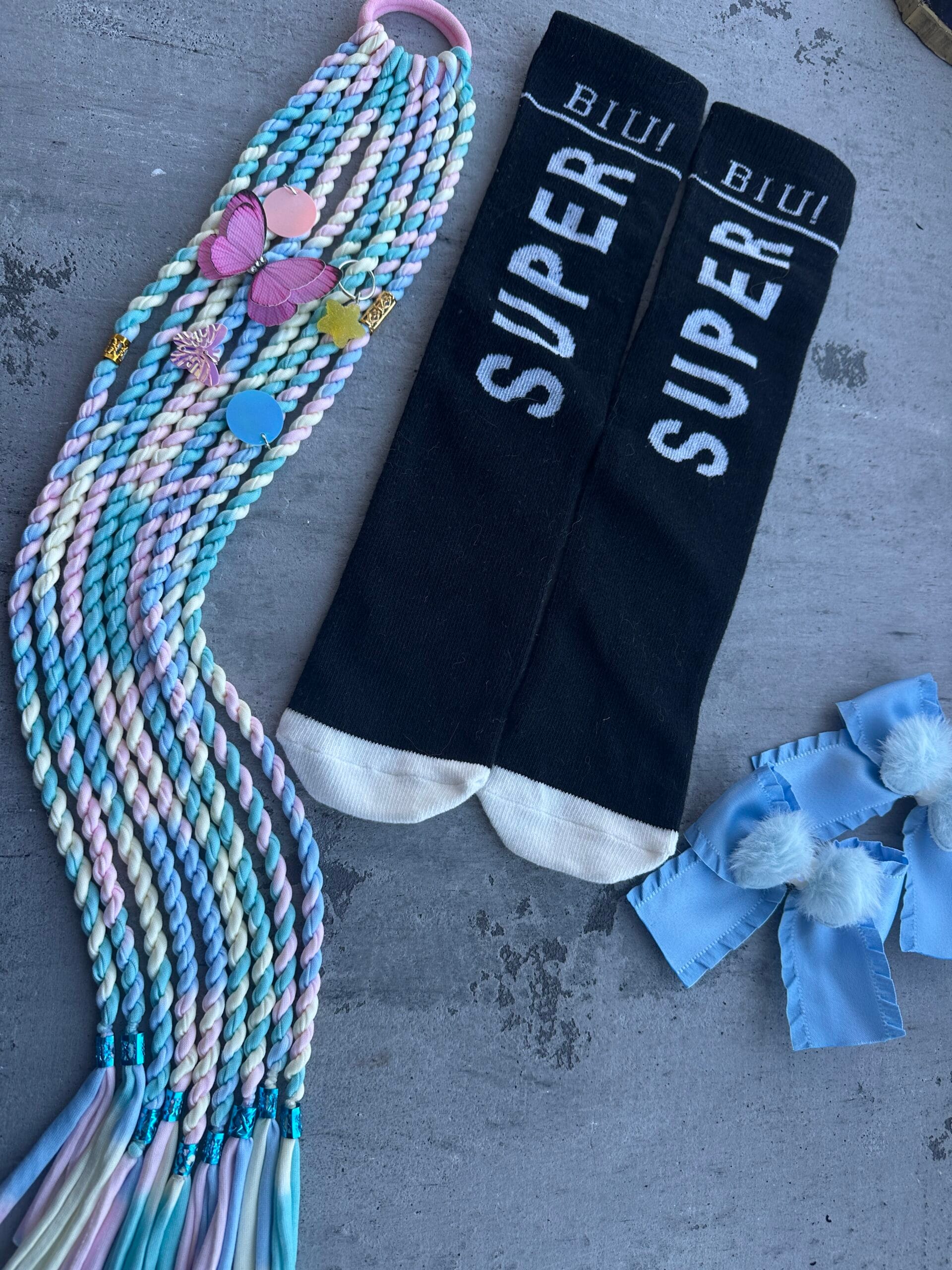 – tai pilnas stilingų aksesuarų komplektas, skirtas mergaitėms, kurios mėgsta spalvas, žaismingus akcentus ir komfortą. Šiame rinkinyje yra rankų darbo plaukų segtukai, ilgos kojinės ir pinta plaukų gumytė, kurios kartu sukuria harmoniją ir išbaigtą stilių.