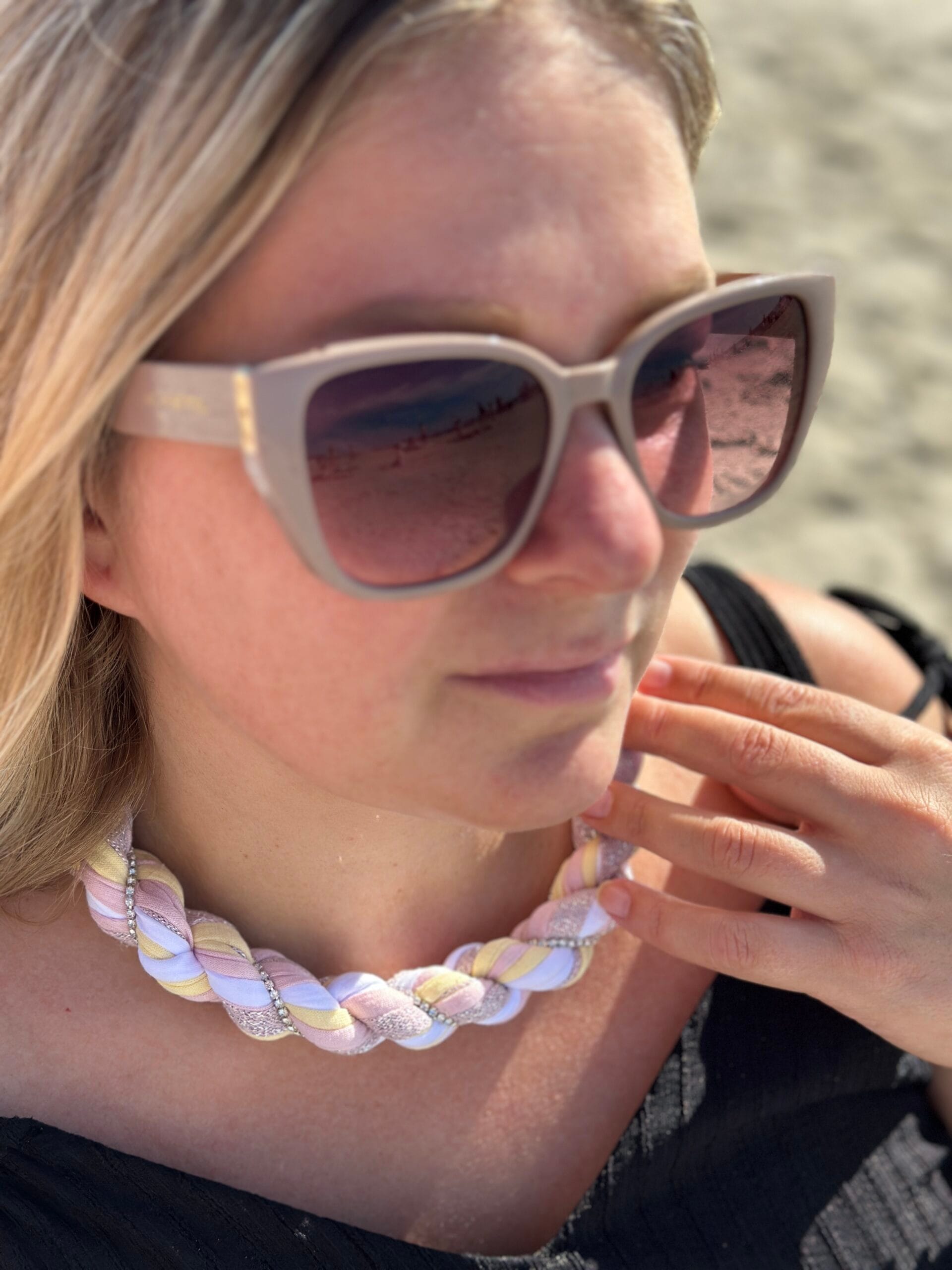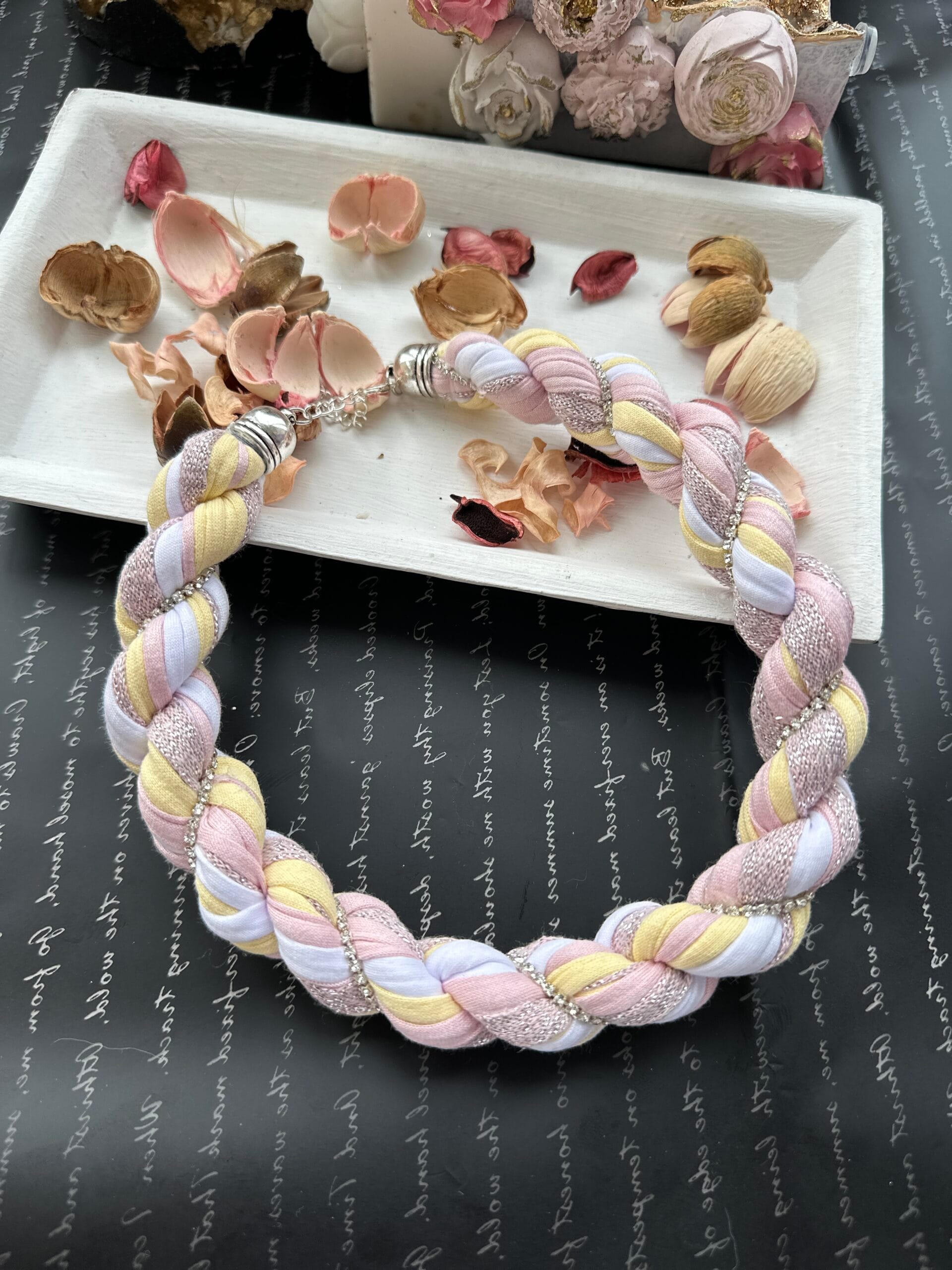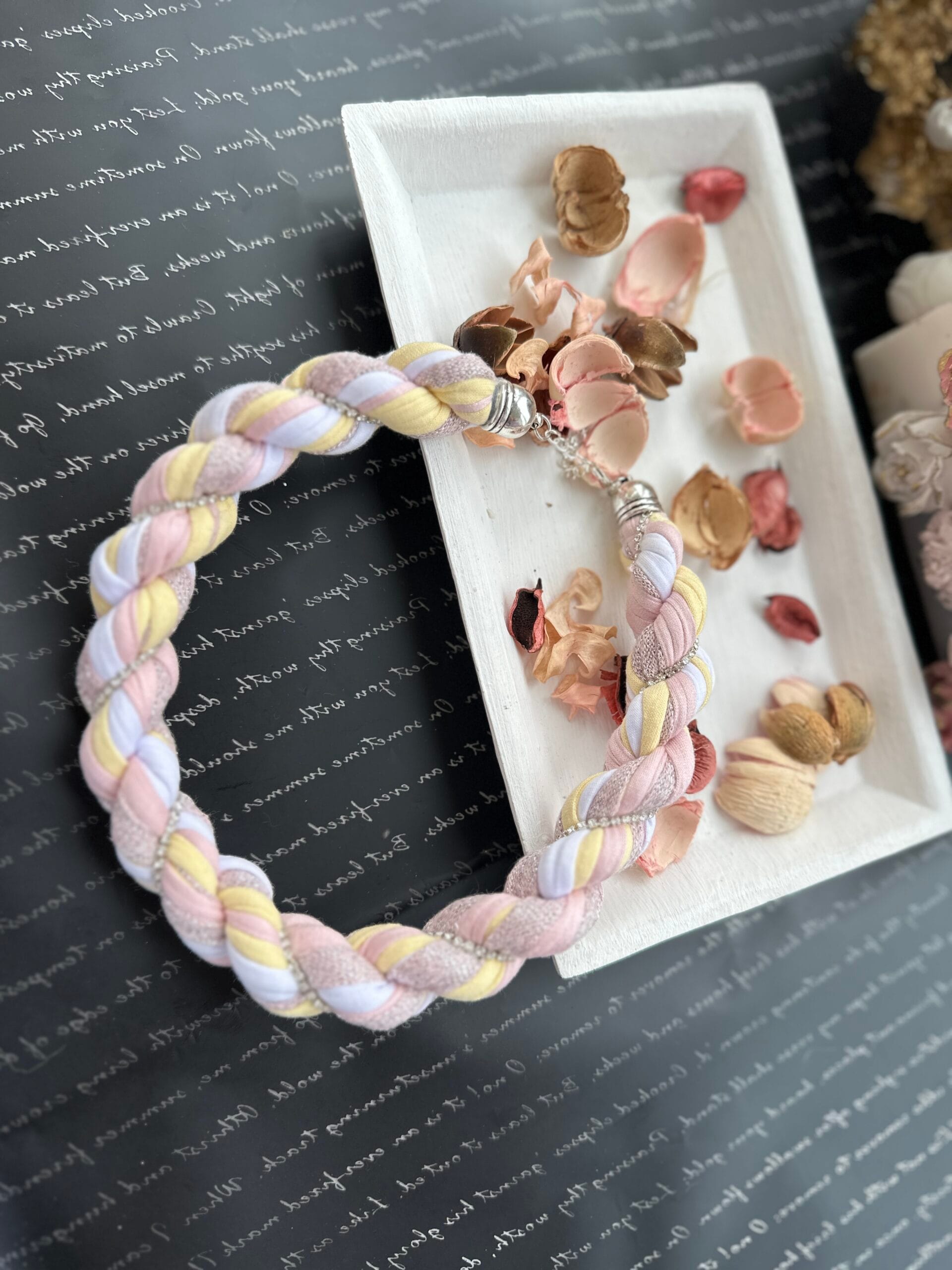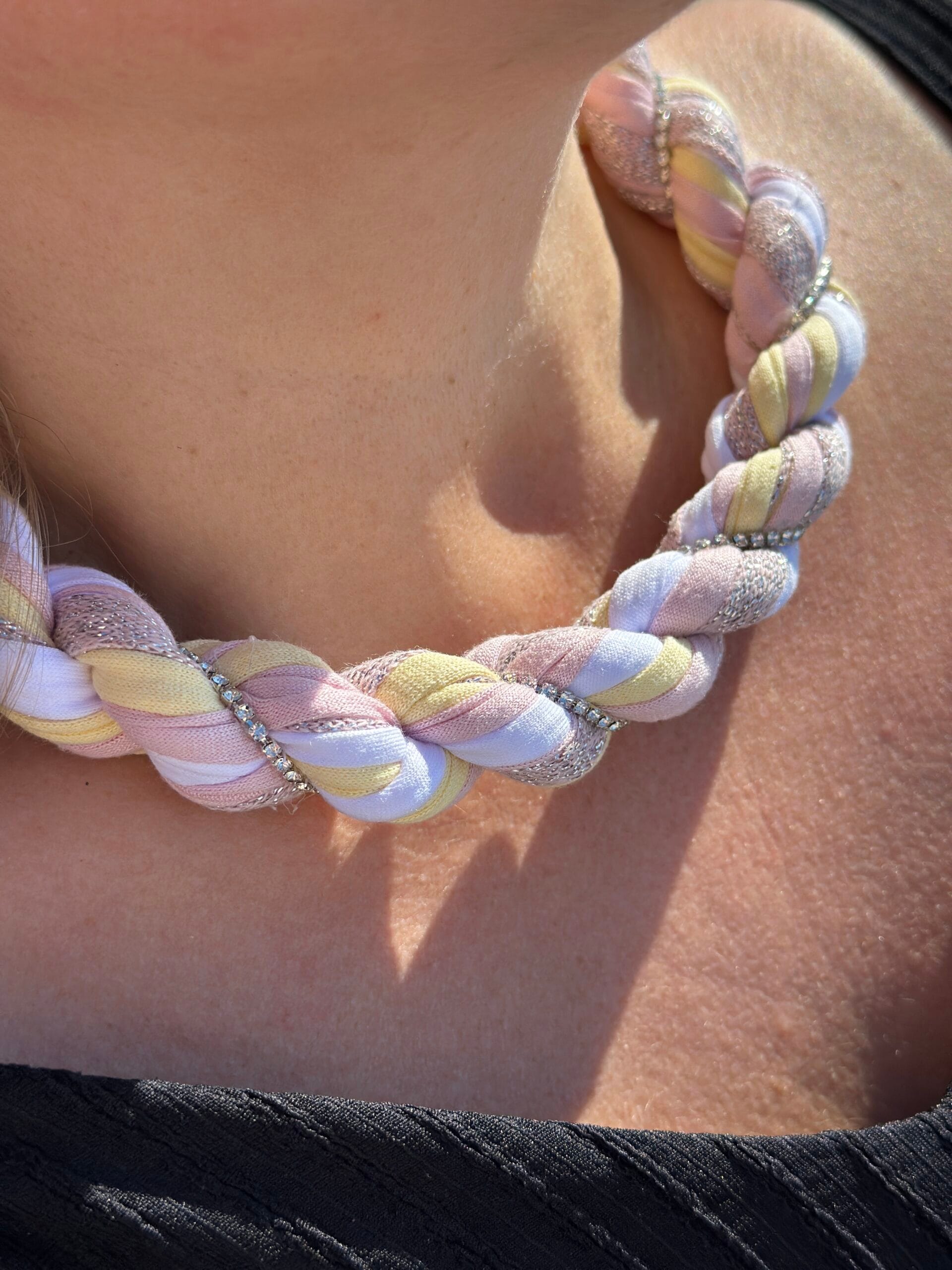Atrask eleganciją, kuri niekada neišeina iš mados. Šis kaklo vėrinys – tai ne tik papuošalas, bet ir stiliaus išraiška, skirta moteriai, kuri vertina prabangą, subtilumą ir unikalumą. Juoda, rankomis pintos juostelės pynė dera su žvilgančiomis kristalų spiralėmis, suteikiančiomis vėriniui išskirtinio žavesio bei modernios prabangos.