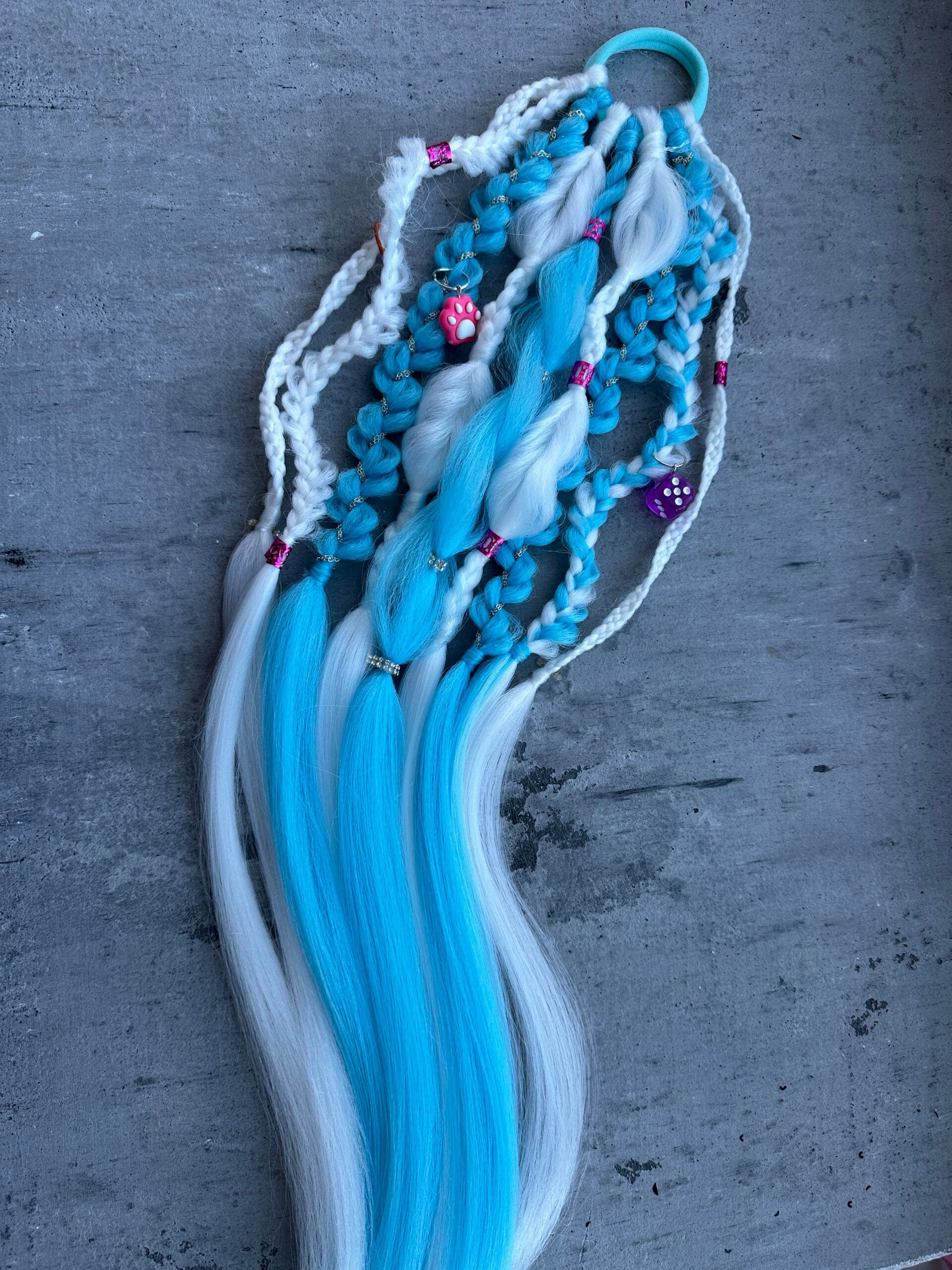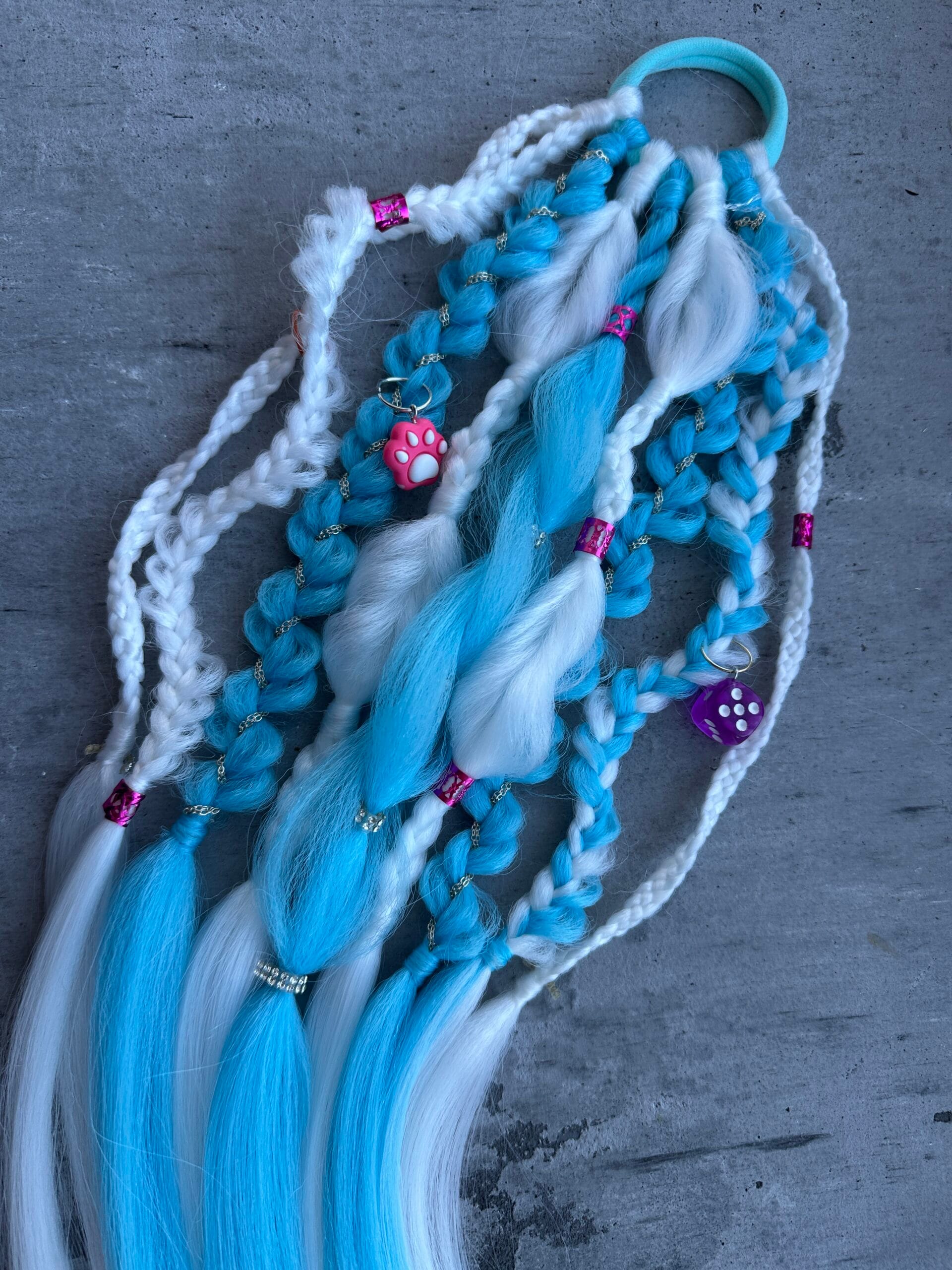 Plaukų gumytė rankų darbo jūra – išskirtinis šventinis aksesuaras, sukurtas iš raudonų, baltų ir sidabrinių sintetinių sruogų. Įvairiai supintos pynės, dekoratyviniai mazgai ir blizgios detalės suteikia gumytei išskirtinę tekstūrą ir apimtį.