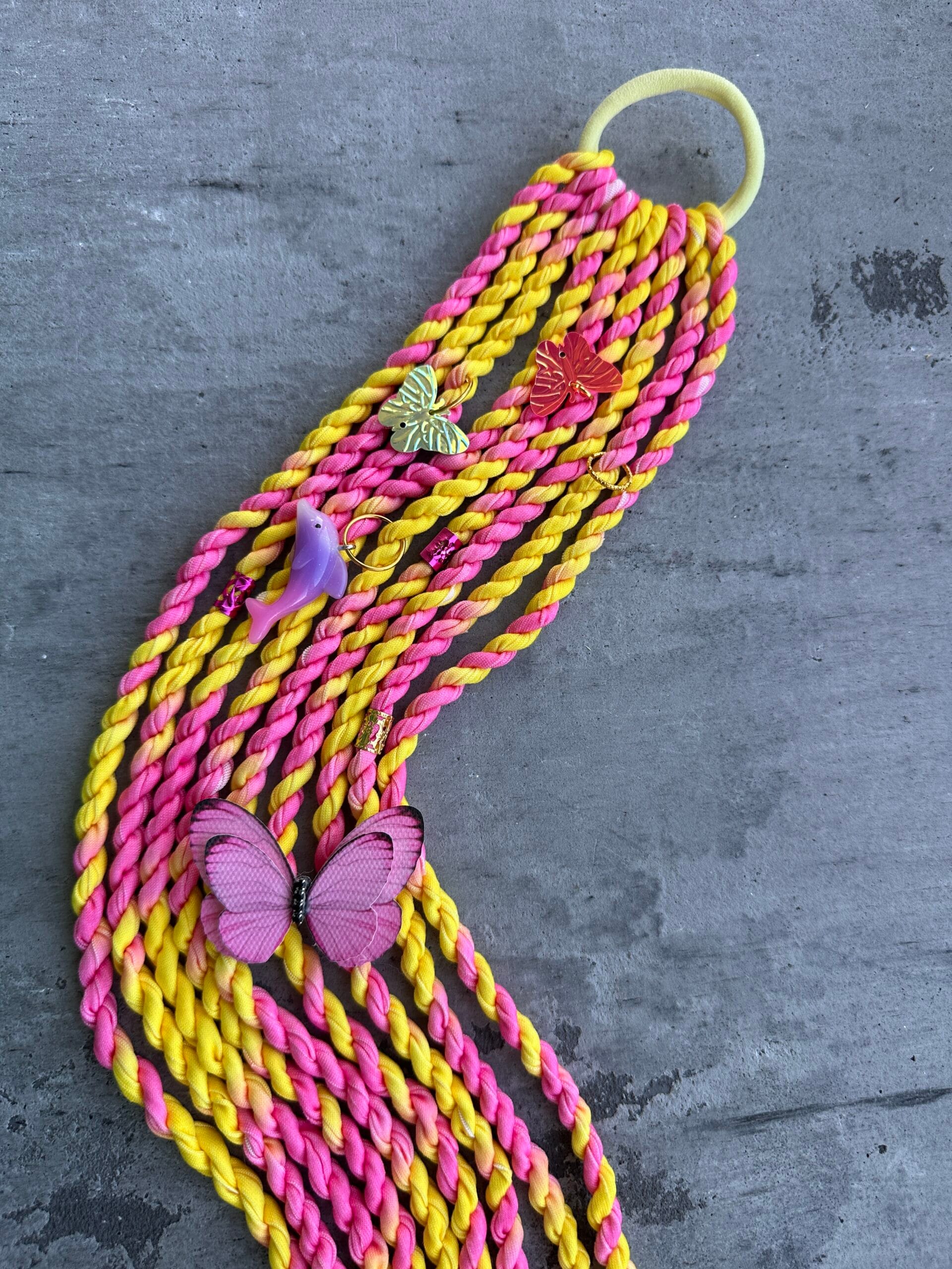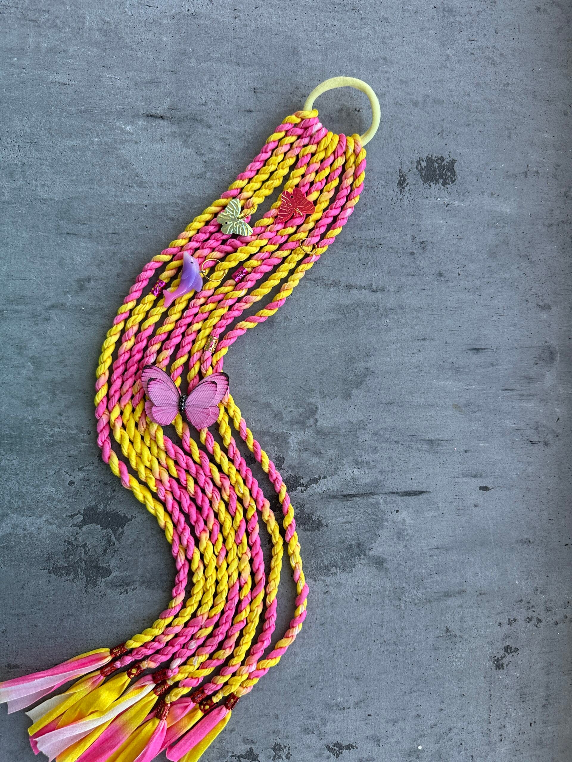 Aksesuaras dekoruotas ilgesnėmis, tvarkingai pintomis kasomis, kurios suteikia išskirtinumo, judesio ir žaismingumo. Tai rankų darbo gaminys, sukurtas su dideliu kruopštumu, todėl kiekviena gumytė yra unikali ir kokybiška.