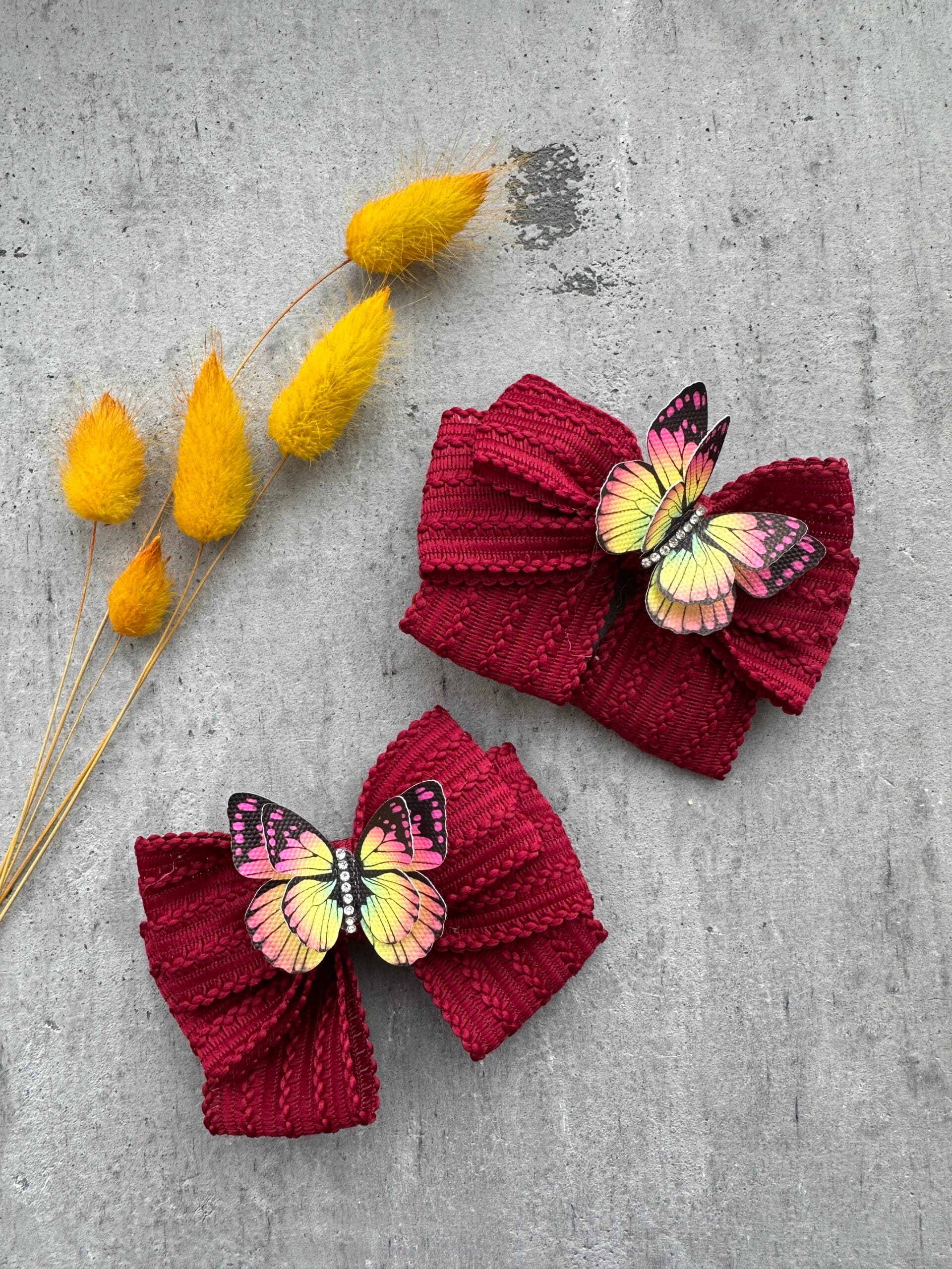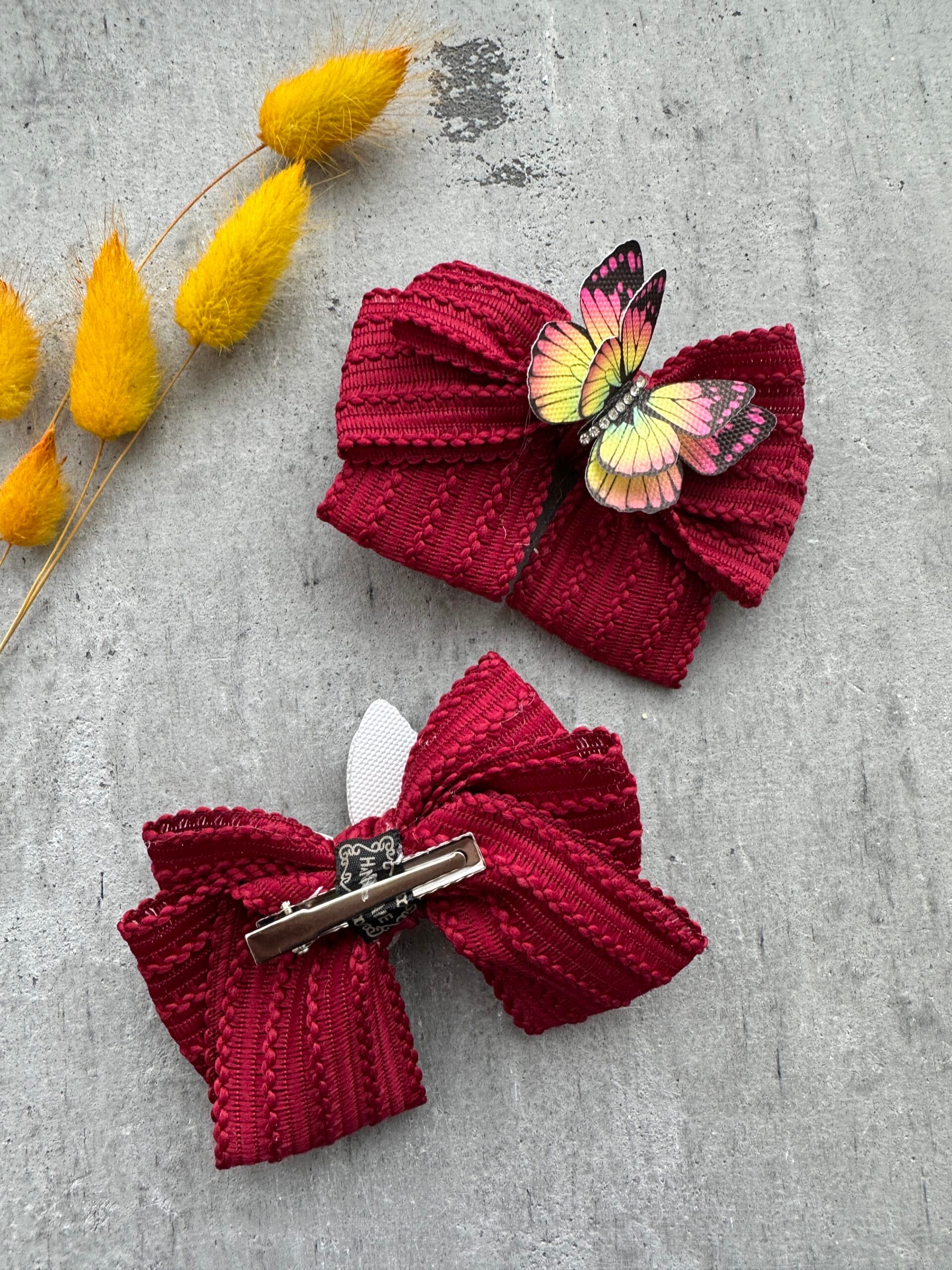 Plaukų segtukai bordo mergaitėms– tai subtilūs ir stilingi rankų darbo plaukų aksesuarai, skirti mergaitėms, kurios mėgsta švelnumą ir eleganciją. Kiekvienas segtukas pagamintas rankomis, todėl kiekvienas yra unikalus. Balti drugelio motyvai suteikia šukuosenai lengvumo, gracijos ir vaikiško džiaugsmo.