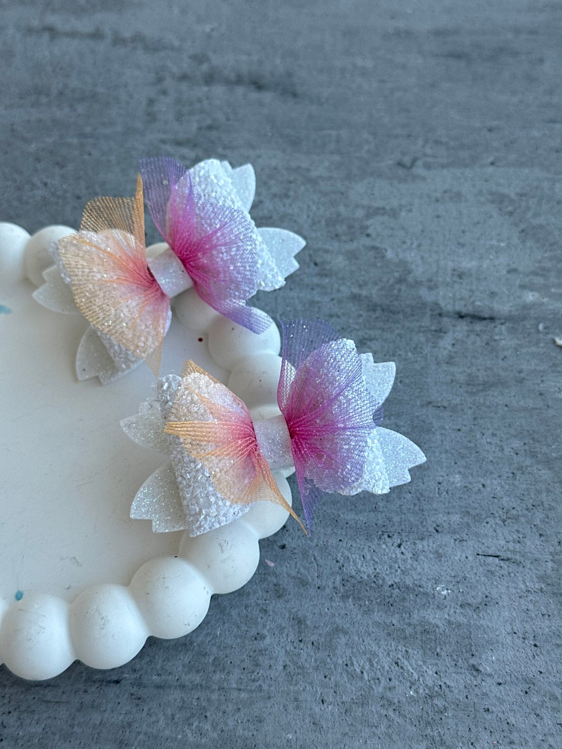 Plaukų segtukai šventiniai kaspinukai – tai subtilūs ir stilingi rankų darbo plaukų aksesuarai, skirti mergaitėms, kurios mėgsta švelnumą ir eleganciją. Kiekvienas segtukas pagamintas rankomis, todėl kiekvienas yra unikalus. Balti drugelio motyvai suteikia šukuosenai lengvumo, gracijos ir vaikiško džiaugsmo.