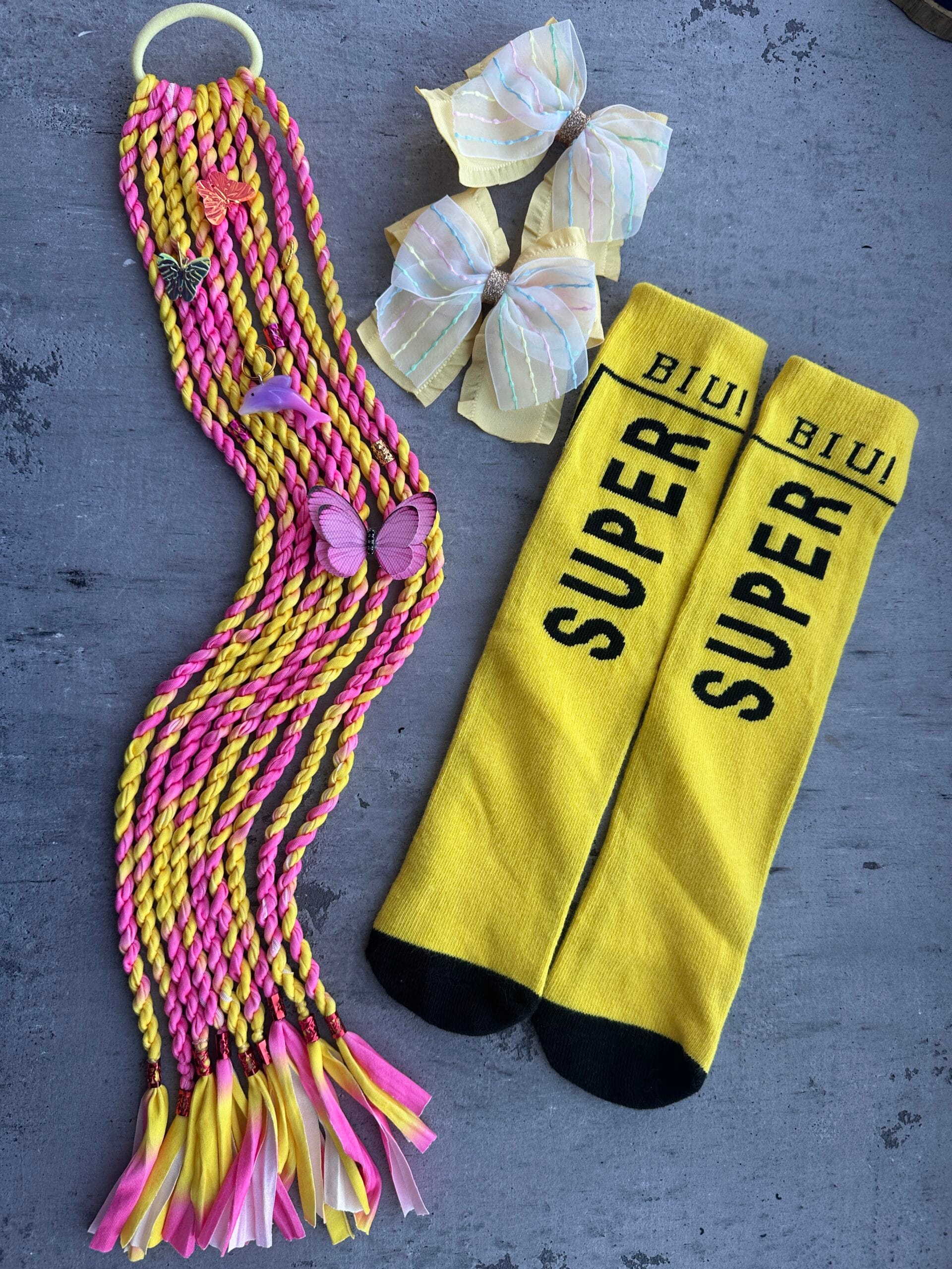 Rinkinys mergaitei plaukų aksesuarų – tai pilnas stilingų aksesuarų komplektas, skirtas mergaitėms, kurios mėgsta spalvas, žaismingus akcentus ir komfortą. Šiame rinkinyje yra rankų darbo plaukų segtukai, ilgos kojinės ir pinta plaukų gumytė, kurios kartu sukuria harmoniją ir išbaigtą stilių.